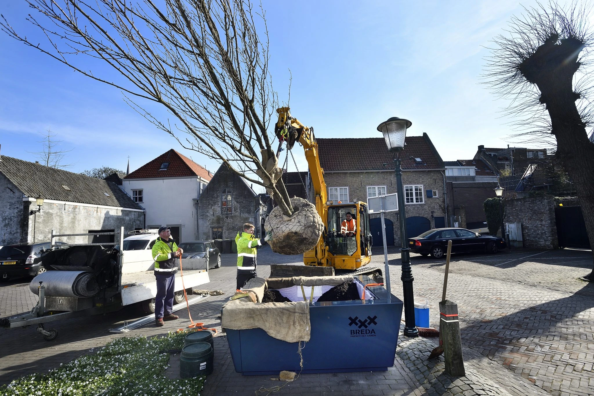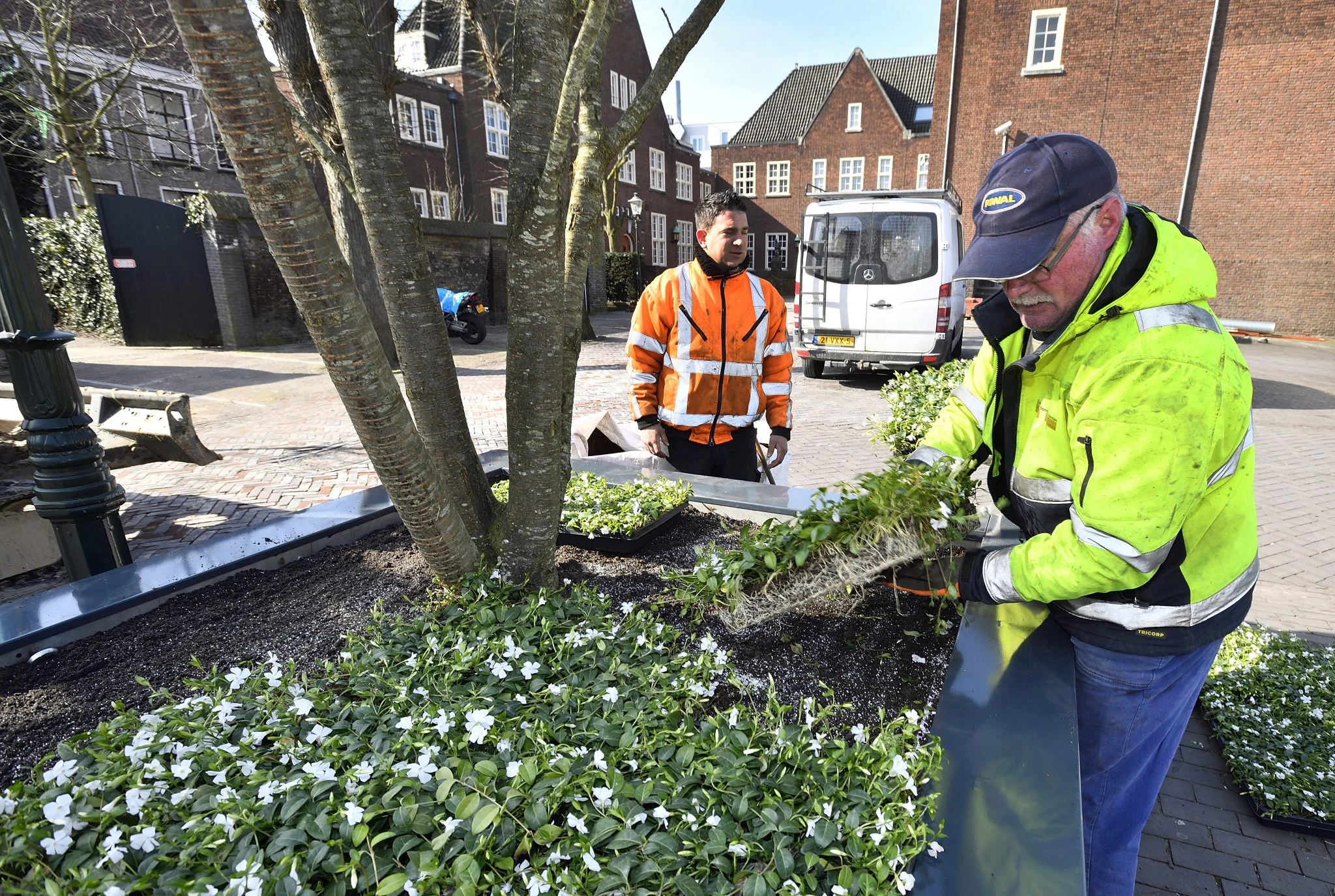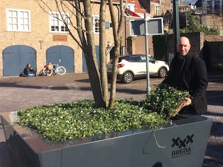 In diesem ersten Baumgefäß in Breda steht der mehrstämmige Prunus ’Royal Burgundy’. Beigeordneter Adank (Stadtentwicklung und Planung, VVD) hat die gebrauchsfertigen Bodendeckermatten (Vinca) von Covergreen an Ort und Stelle platziert.