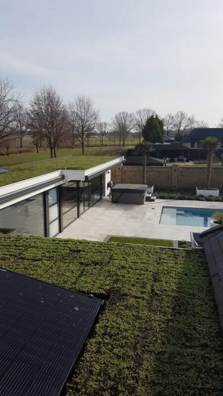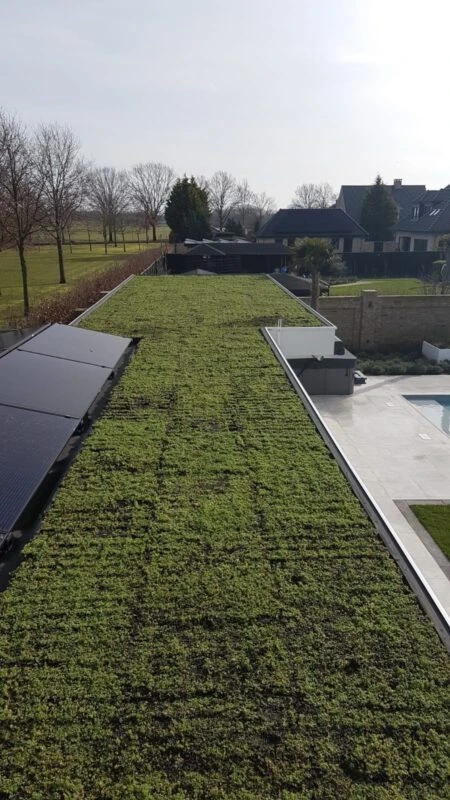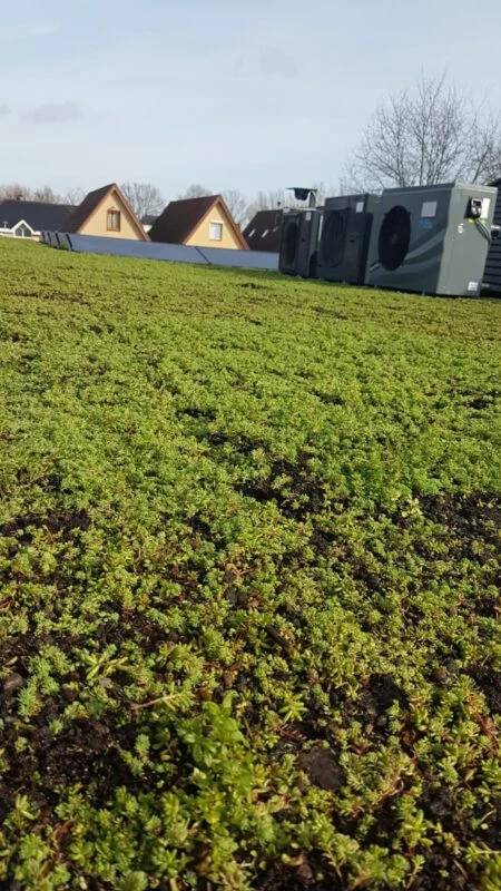 Auf diesem Dach wurden die Kassetten mit Solarmodulen kombiniert! Begrünung in Kombination mit grüner Energie – das schafft eine tolle Synergie, die wir noch öfter zu sehen bekommen werden. Untersuchungen haben gezeigt, dass Solarmodule bei niedrigeren Umgebungstemperaturen bessere Erträge erzielen. Ein grüner und natürlicher Lebensraum senkt die Umgebungstemperatur. Daher ist die Kombination von einem grünen Dach und Solarmodulen so effizient. Daneben haben unsere Sedum-Dachkassetten den Vorteil, dass sie bei Unterhaltsarbeiten am Dach oder bei einem Hauseigentümerwechsel leicht zu entfernen sind und nach Beendigung der Arbeiten wieder unbeschädigt an ihrer alten Stelle platziert werden können.