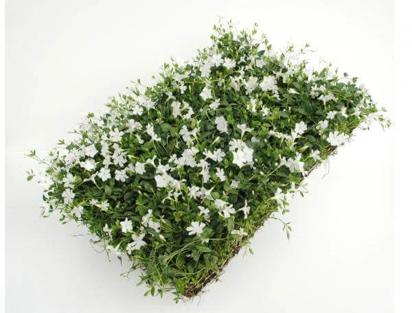 Der Einsatz von Bodendeckern für einen pflegeleichten Garten ist eigentlich nichts Neues. Mit den Standard-Bodendeckern aus den üblichen Pflanzentöpfen dauert es allerdings einige Jahre, bis der Boden vollständig bedeckt ist. Unsere Bodendecker werden in einer Art gebrauchsfertigem System geliefert, bei dem pro Matte (oder Pflanzenmatte, wie wir es nennen) ungefähr 0,22 m² Boden/Erde direkt voll abgedeckt sind. Legt man mehrere Pflanzenmatten aneinander, lässt sich sehr einfach von Tag eins an ein großes Stück Garten vollständig mit Grün bedecken.