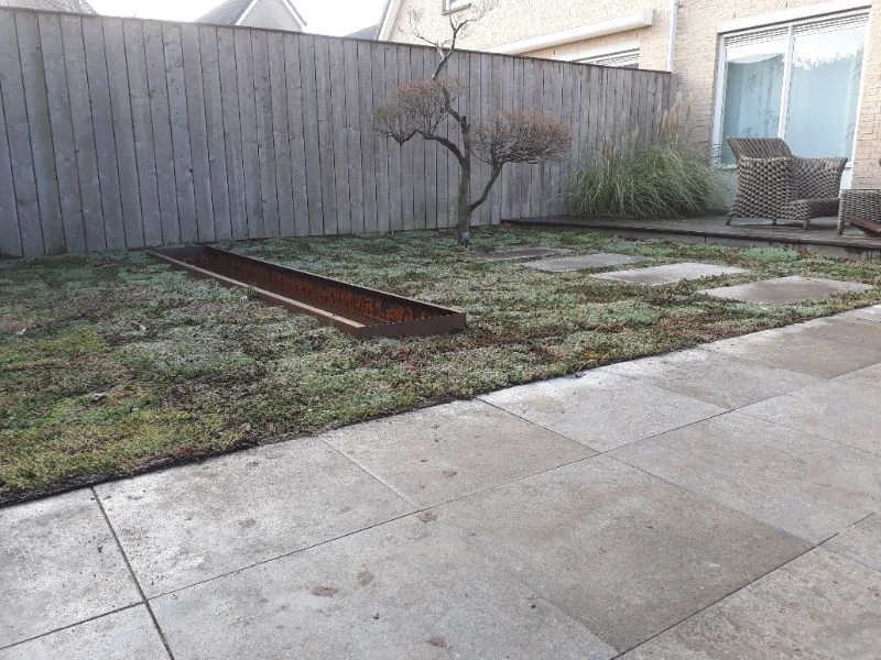 ‘For starters, we installed drainage tubes and connected them to the rainwater discharge. After that we mixed the soil with masonry sand. The natural stone terrace has been replaced to lead the drainage out of the garden, in stead of towards the sedum. Finishing touch was smoothing the soil and installing the ready-to-use sedum mats by Covergreen. To create one unity we replaced the wooden elevation by gabions filled with natural stone.’